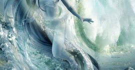 εμπρός του μια χρυσομαλλούσα Νεράιδα-Θεά με ολόχρυσα μαλλιά , καταγάλανα μάτια, ολόλευκο